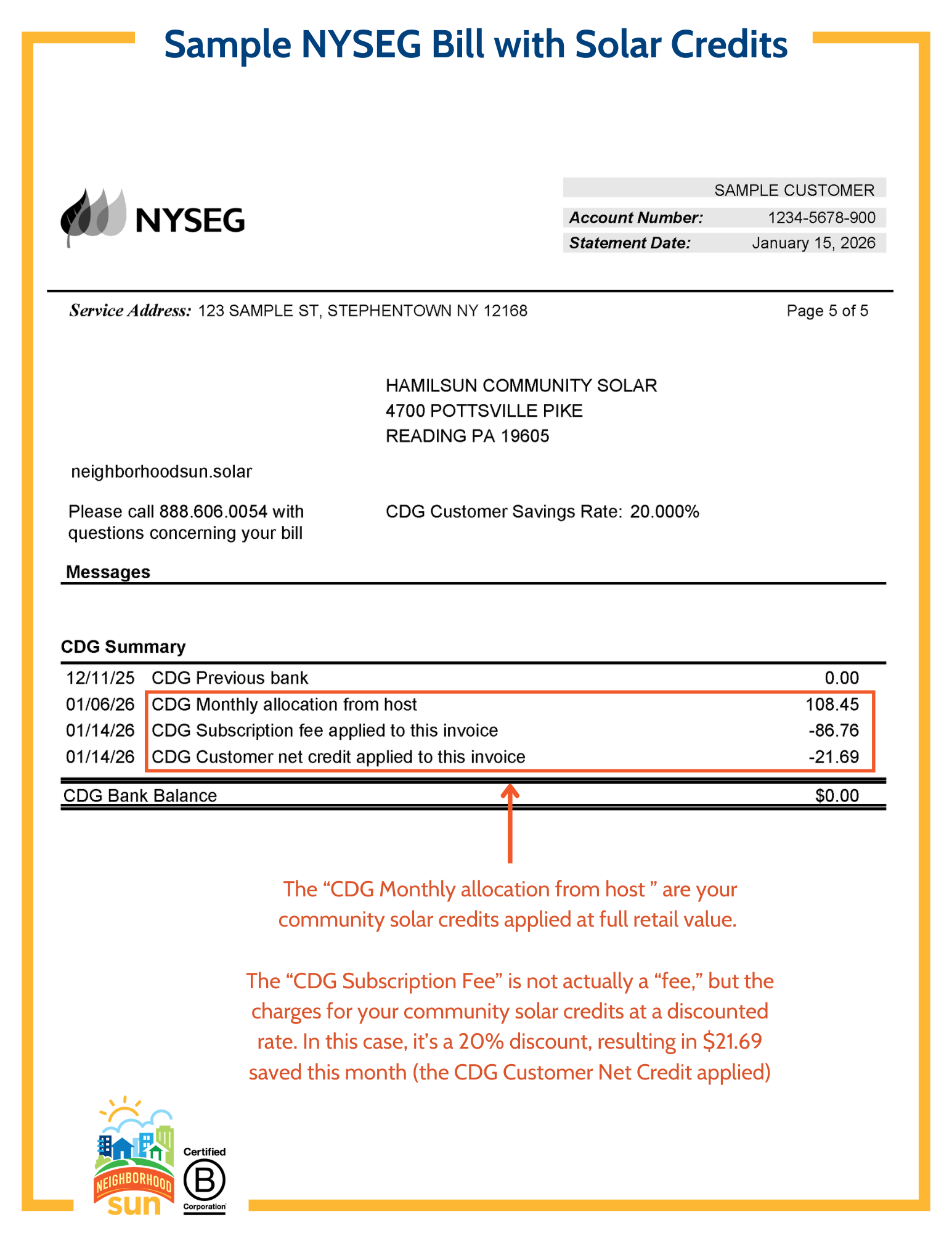 If you reside in a state with dual-billing, you will receive a separate bill from Neighborhood Sun for the credits you saw on your utility bill, which you pay Neighborhood Sun for at a discount, leading to savings when you consider the sum of both bills. In states with consolidated billing like New York, there is no need for the separate bill, so you just see the credits reducing your utility bill and don’t have to worry about anything else.