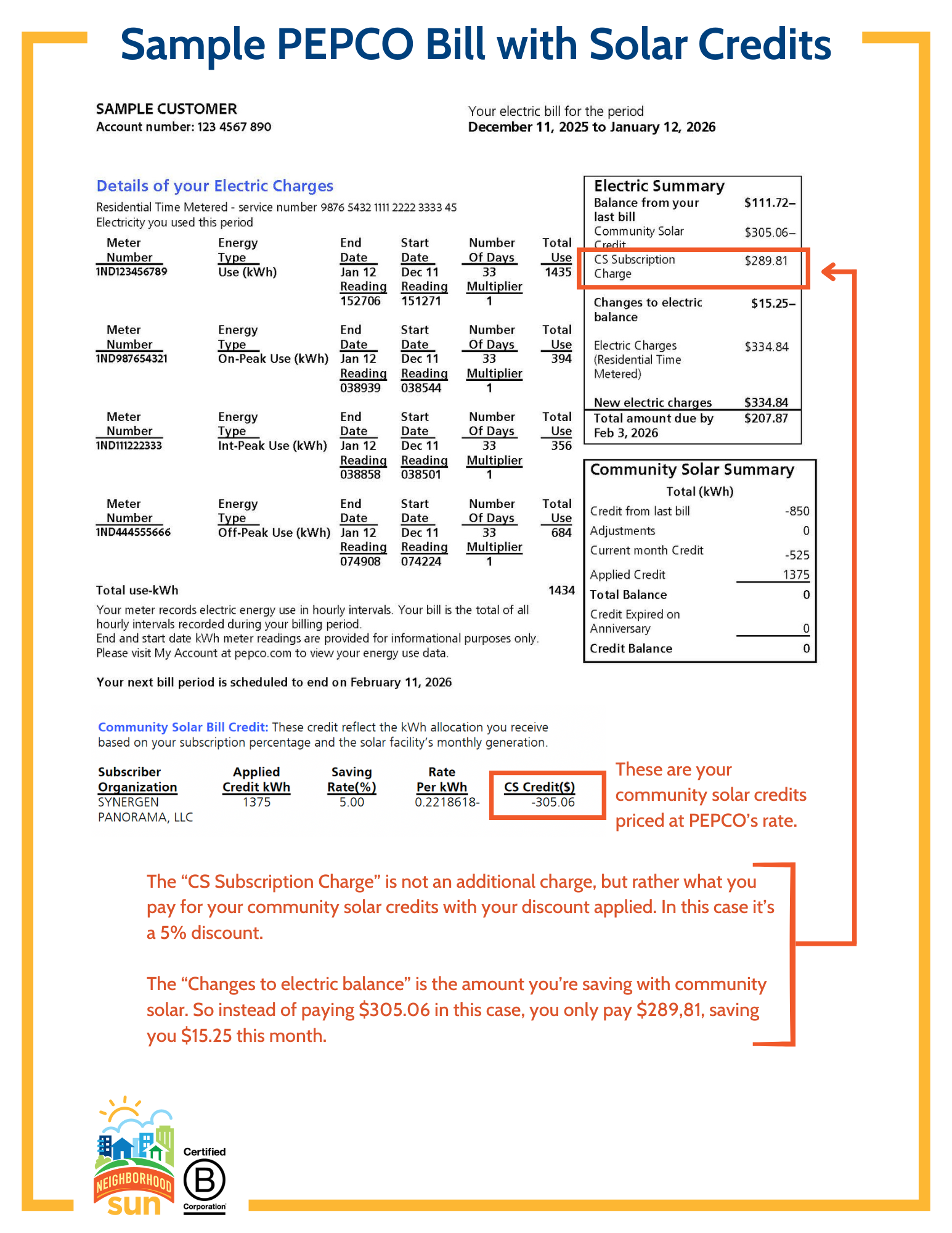 As a Neighborhood Sun subscriber, you’ll continue to receive your same utility bill. Neighborhood Sun’s community solar credits (which are generated by your “share” of a community solar farm in your utility territory) will be included on your current utility bill, reducing your total energy cost.